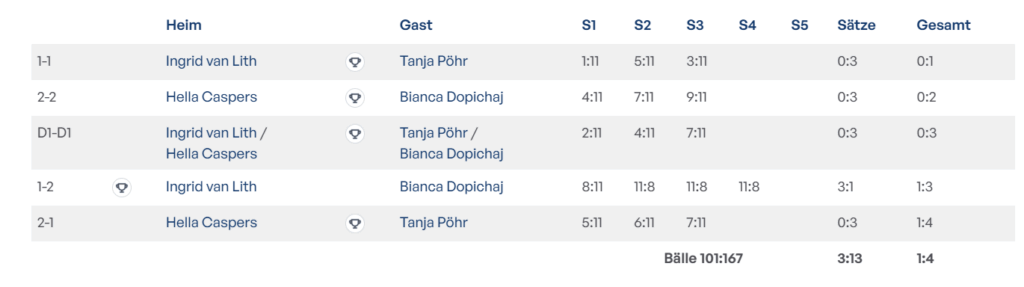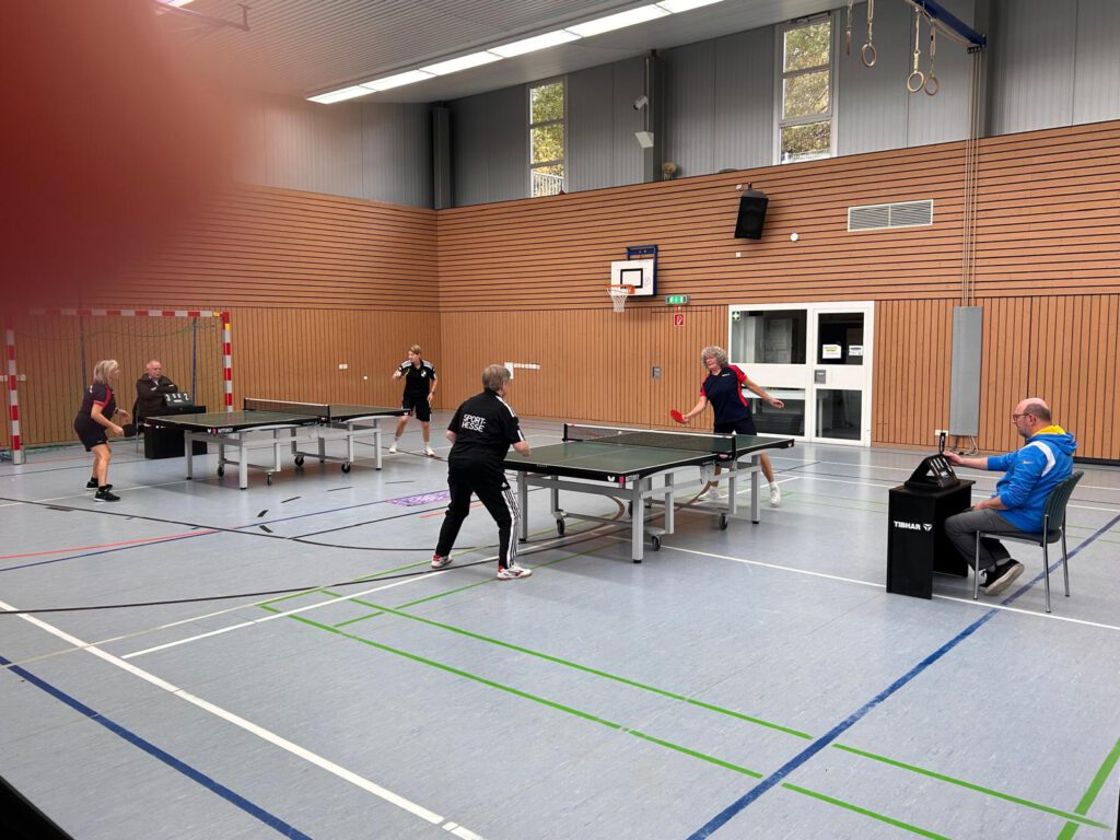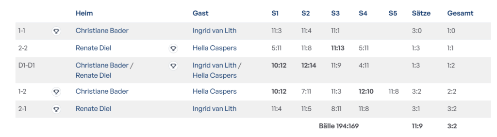 Hella und Ingrid spielten klasse und hielten die Partie bis zum Ende spannend. Hella gewann ein Einzel, die beiden zusammen das Doppel. Im letzten Einzel verlor Hella knapp in fünf Sätzen.